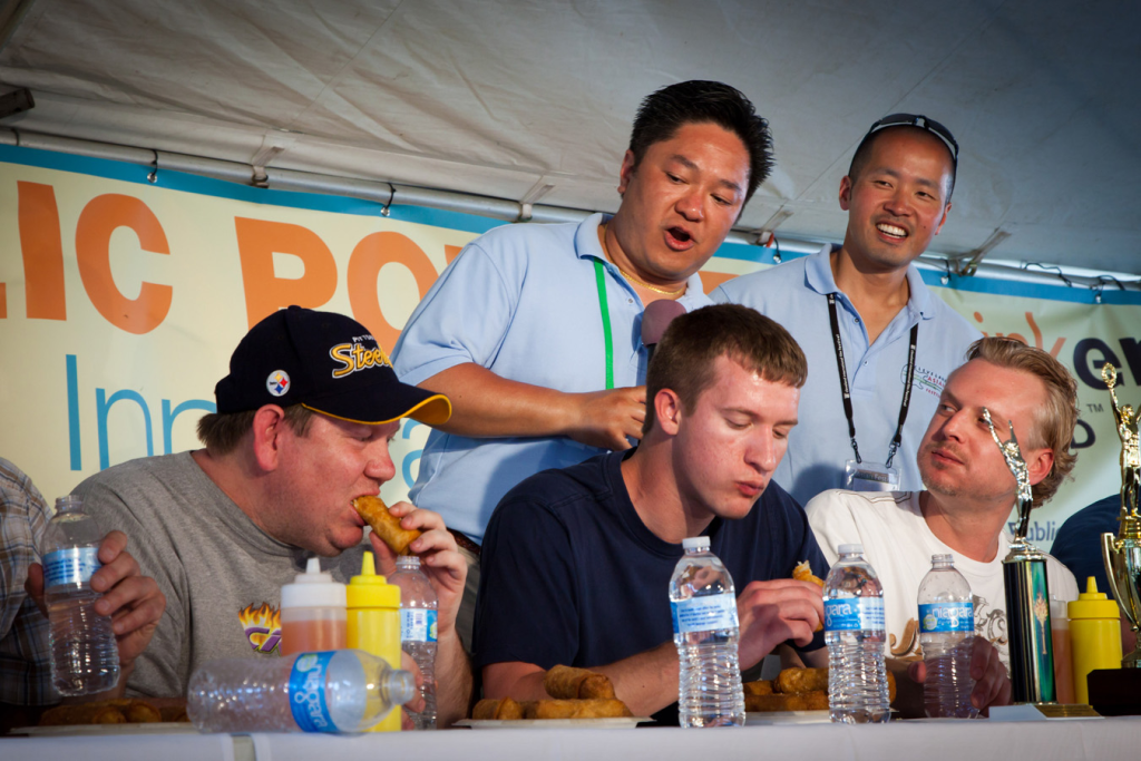 – While eating Egg Rolls, the contestants may drink (non-alcoholic) beverages of their choosing or water provided by the festival.